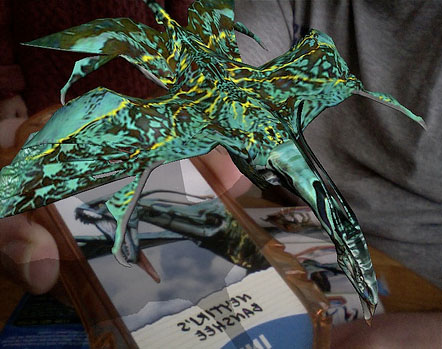 1- 3D virtuelle La première catégorie explore le potentiel de simulation de l’ordinateur via de nouvelles interfaces. On déclenche à l’écran (2D) des animations semi-autonomes (3D) via des capteurs visuels (webcam) d’un objet référent (généralement une surface 2D, comme la couverture d’une revue ou une feuille avec un code graphique).